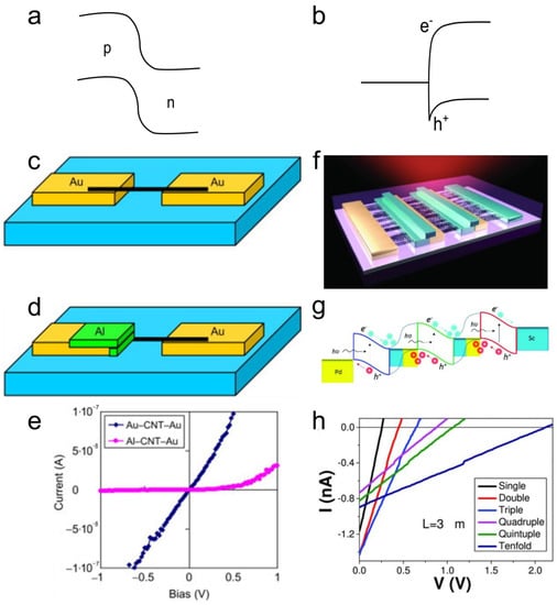 (a,b) Sketch of a p-n junction (a) and a Schottky junction (b). (c–e) Fabrication process of Au–CNT–Au (c) and Al–CNT–Au (d) photodiodes using a single CNT; and their I–V characteristics (e). (c–e) Modified from Ref. []. (f–h) Schematic structure of the cascade photovoltaic module consisting of N = 3 cells connected in series with two virtual contacts (f); corresponding energy band diagram illustrating the excitation and carrier accumulation process under light illumination (g); and corresponding I–V characteristics of the tandem cells with N = 1 (black), 2 (red), 3 (blue), 4 (pink), 5 (green), and 10 (Navy blue) individual cell in series during the measurements (h). Devices were measured under an incident power of 5.78 W cm−2 with λ = 1800 nm. Reproduced from Ref. [] with permission from Wiley.
