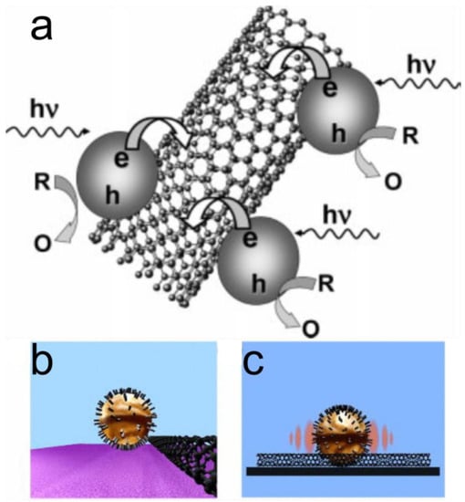 Several groups have shown that the photoresponse in CNT-based photo-devices can be improved when the CNTs are functionalized with other nanostructures. In particular, they have been decorated with either semiconducting [,,] or metal nanoparticles [,]. In the former case, the semiconducting material can be for instance TiO2 or CdS. The enhancement in this hybrid system is ascribed to the charge transfer occurring between the semiconductor nanoparticle and the CNTs (Figure 6a). Once an excited electron is generated in the nanoparticle after absorption of a photon with energy larger than the nanoparticle bandgap, it can be transferred to the CNT and thus contribute to the overall electrical signal. In this case, the enhancement is due to the absorption of photons at a particular energy by the semiconducting nanoparticle. In the case of metal nanoparticles, instead, the enhancement of the photocurrent is due to the strong plasmonic local field that they generate on the CNTs (Figure 6b,c). Thus, this enhancement is not localized at a given wavelength, but it occurs in the whole spectrum where CNT are sensitive.