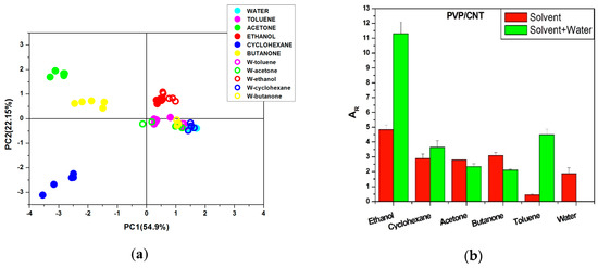 Disease detection and health monitoring by exhaled breath analysis has recently gained huge attention because of its various advantages such as non-invasiveness [1,2,3,4,5,6,7,8,9]. Volatile organic compounds (VOC) are released in breath by venous blood in which they are produced as by-products of metabolic reactions, diseased organs, or infections inside a patient [10,11,12,13,14]. Among all gas molecules produced by the body, the volatolome, some VOC are typical of diseases and called biomarkers. These VOC are sometimes difficult to detect directly from blood analysis [15], therefore breath analysis provides a quick and convenient tool to diagnose diseases such as asthma, lung cancer, inflammatory diseases, and stomach and liver abnormalities [16,17,18,19,20]. However, exhaled breath contains large amounts of nitrogen, oxygen, carbon dioxide and water vapors, and very small fractions of VOC at the ppm (part per million) to ppb (parts per billion) level. Different techniques can be used to sense such low amounts of vapors to monitor health [21,22,23]. Among all methods available, conductive polymer nanocomposites (CPC) sensors [24,25,26,27,28], optical sensors [29,30,31], metal oxide based gas sensors [31,32,33,34,35], and biosensors [36,37,38] have gained popularity for vapor sensing applications and in particular e-noses. In the literature, a special attention is paid to the collection of breath [39,40,41,42] and the detection is mostly done at ppm or ppb concentrations, which more or less satisfies the final objective to develop an e-nose from the assembly of such sensors in array, but in most sensing experiments VOC are tested alone. However, in a real case scenario the VOC are dispersed in huge amounts of water vapors in breath. The amount of water vapor in breath is also an important issue for mechanically ventilated patients for whom an active humidifier is used [21], that varies the amount of water in their breath. To facilitate the analysis of breath biomarkers, despite the presence of variable amounts of water, it can be removed by condensation or pre-concentration using different methods [43,44,45,46]. However, many water-soluble VOC can also be lost in significant amounts, which can make very difficult the analysis of data and complicate the disease prediction. Therefore, it appears useful to understand how a large amount of water molecules can affect the analysis of small concentrations of VOC biomarkers, by a sensor array for breath analysis application [22,47].