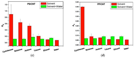 It can be noticed that for a hydrophilic transducer such as PVP-CNT (red bars in Figure 7a), the saturation time of all solvents in the third cycle is always larger than that of water in the third cycle. But, whereas for polar vapors like acetone and ethanol tS is only slightly longer than that of water, for non-polar vapors such as toluene and cyclohexane tS can be respectively 60% and 40% longer than that of water. As already noticed butanone has an intermediate behavior due to its semi-polar nature. This means that when the transducer is hydrophilic, water can diffuse to the remaining junctions almost at the same speed as other polar vapors but much faster than the non-polar vapors, which is providing another way to discriminate analytes than simply using the maximum amplitude of signals.