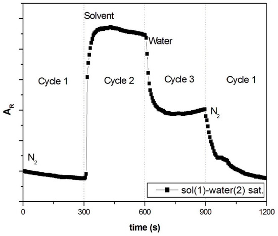 Exposing vQRS to N2-VOC-H2O saturated vapors sequences according to the configuration described in Figure 1c yields the striking behavior shown in Figure 4. It can be observed that during the third cycle water molecules are removing the solvent molecules already adsorbed at the sensors’ nano-junctions, resulting in a decrease of responses’ amplitude, a phenomenon which becomes steady after a certain time. This amazing effect may come from the lower concentration in water molecules at saturation (Table 2) leading to a concentration gradient that would initiate the diffusion of solvent molecules out of the sensor, until a dynamic equilibrium is established between adsorption of water molecules and desorption of solvent molecules.
