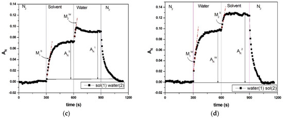 This assumed concentration gradient effect was eliminated by decreasing the number of molecules hitting the vQRS, replacing the bubbling unit with an OVG. This device is able to generate only ppm amounts of VOC and water successively, in controlled conditions using the configuration test of (Figure 5a,b). Two types of experiments were performed by sending in the second and third cycles 100 ppm of VOC or water vapors in the setup, respectively labelled experiment 1 and 2. Surprisingly, similar effects were observed for all vapors in the two experiments as shown in Figure 5c,d. Sending only 100 ppm of VOC or H2O vapors in the sensors’ cell resulted in increasing AR of all sensors in the third cycle for both experiments, whereas using saturated vapors was leading to the opposite effect (a decrease of Ar). It can also be noticed that in all cases AR signals are reaching a plateau after every injection, indicating that 100 ppm of molecules are not sufficient to saturate all the active absorption sites in the sensors and induce the swelled of the matrix by clustering. The clustering step of the diffusion of molecules in a polymer nanocomposite has well been modelled in previous works and cannot be extensively described here [64,67,68]. In few words when the diffusing molecules enter the matrix in too large amount, they see only molecules with the same chemical nature already adsorbed on the sensors sites and thus they are accumulating in large amounts creating a volume expansion of the polymer that leads to very larges Ar characterized by the absence of plateau.