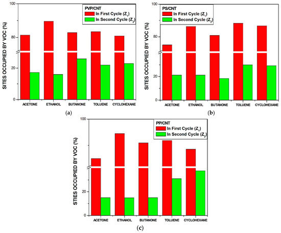 Comparing the Z2 values for the three vQRS shows that polar vapors like ethanol and acetone lead to lower Z2 values than non-polar ones such as cyclohexane and toluene. The case of butanone is particularly interesting as it is a semi-polar molecule by nature, that can exhibit a non-polar character with PVP-CNT sensor (hydrophilic) and a polar one with both aPP-CNT and aPS-CNT sensors (hydrophobic), as attested by its Z2 value of 26% for PVP-CNT, 18% for aPS-CNT and 15% for aPP-CNT. Figure 6 shows that 16% of the active sites were occupied by ethanol and acetone in PVP-CNT, and about 20% in aPS-CNT and 15% in aPP-CNT sensors, while the Z2 values of cyclohexane and toluene were 23% for PVP-CNT, 31% for aPS-CNT and respectively 37% and 31% for aPP-CNT. Hence in the third cycle, non-polar vapors can occupy up to 20% more active sites than polar vapors in the presence of H2O molecules.