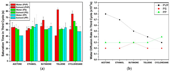 As already pointed out in the previous paragraph, the effect of water on VOC detection depends on the number of adsorption sites available, on the polarity of vapors but also on the difference of interactions between these vapor molecules and the polymer matrix of the transducer. Behind the simple statement of the hydrophilic nature of PVP and the hydrophobic behavior of PS and PP that can explain roughly the detection results obtained, it is interesting to refine this analysis by considering the diffusion kinetics of analytes in the transducer. An indirect way to approach this notion is to follow the time required by the transducer to reach a plateau (the saturation time tS is determined by the intercept between the slope at origin and the plateau), and the speed at which this equilibrium is reached (the saturation rate is determined by the slope at origin ). These two parameters can be easily determined from the typical curves expressing the chemo-resistive response Ar against time of Figure 5. Data have been collected only from experiments 1and 2 during their third cycle (water in experiment 1 and VOC in experiment 2) and tS and have been plotted in Figure 7a,b respectively.