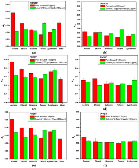 Maximum amplitudes of the chemo-resistive responses Ar of vQRS exposed to five different VOC mixed with 100 ppm water, (a) PVP-CNT @100 ppm, (b) PVP-CNT @12.5 ppm, (c) aPS-CNT @100 ppm, (d) aPS-CNT @12.5 ppm, (e) aPP-CNT @100 ppm, and (f) aPP-CNT @12.5 ppm.