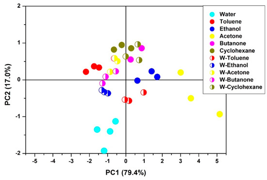 PCA mapping for 100 ppm of VOC (solid circles in front of solvent name) and mixes of 100 ppm VOC with 100 ppm H2O (semi-solid circles of the same colour with W in front of the name of the solvent).