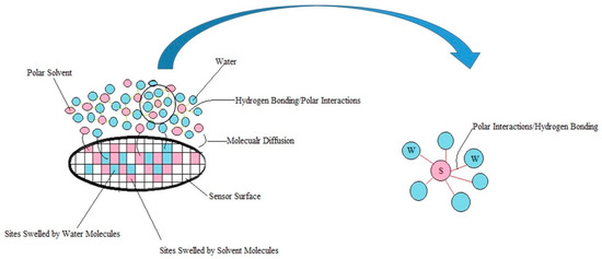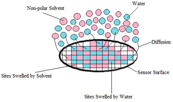 - Secondly, the non-polar vapors like cyclohexane and toluene are more effective to free the active sites occupied by water at junctions, than polar VOC such as acetone and ethanol because their affinity for the polymer matrices is larger. Additionally, polar–polar interactions resulting in partial solubility of polar solvents molecules in water could prevent them from directly competing on the sites. This behavior is further confirmed in Section 3.3, and the corresponding mechanism is discussed in Section 3.4.