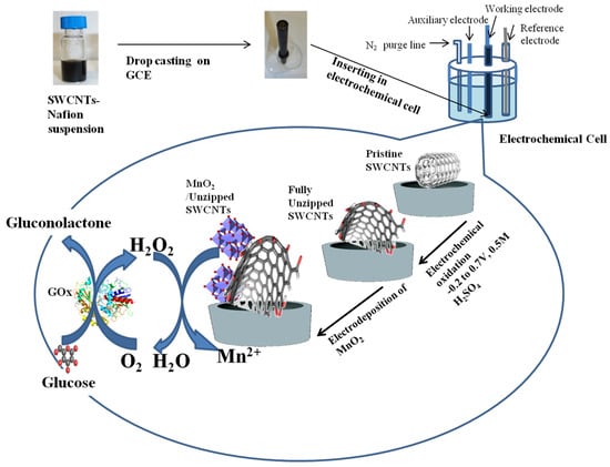 The modified GCE was subjected to electrochemical oxidation in potential window of −0.2 to 0.7 V, at scan rate 100 mVs−1 in 0.5 M H2SO4 for 12 h. Then, MnO2 was electrodeposited on the surface of unzipped SWCNTs/GCE by repetitive scanning cycles by applying potential window of 0.3 to 1.3 V in a solution of 0.1 M Na2SO4 and 5.0 mM MnSO4. The electrochemical setup, including the steps of preparation method of modified glassy carbon electrode (GCE) and electrochemical reactions in sensing H2O2 and glucose, is illustrated in Figure 1.