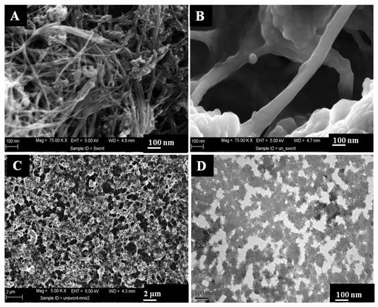 In addition, Figure 2C,D depicts the spike-like MnO2 anchored with edge carbon generated during transformation of SWCNTs to unzipped SWCNTs. The homogeneous structure of MnO2/unzipped SWCNTs film suggests that MnO2 was successfully attached on the surface of unzipped SWCNTs.