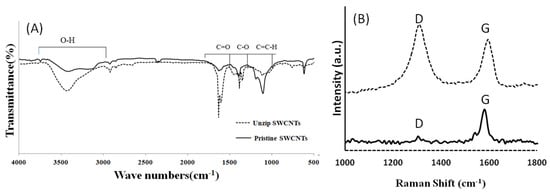 In order to confirm the oxidative opening (unzipping) of SWCNTs, we carried out Fourier transform infrared spectroscopy (FTIR) and Raman spectroscopy analyses. The FTIR (Figure 3A) spectrum of unzipped SWCNTs illustrates higher absorption of O–H group in the regions of O–H (3000–3700 cm−1) and C=O modes (1700–1750 cm−1), and lower absorption in the regions of C–O (1000–1250 cm−1) and C=C–H (800–1000 cm−1) compared to the spectrum of pristine SWCNTs. Moreover, Raman spectra (Figure 3B) also confirmed the fully unzipping of pristine SWCNTs. The G and D bands of SWCNTs has been reported as the characteristics of sp2 carbon atoms and the extent of defects of carbon nanostructure respectively [37]. The spectrum of unzipped SWCNTs in Figure 3B shows the intensity of the D band at 1360 cm−1 and the G band at 1600 cm−1 s increased and broadened compared to the pristine SWCNTs. This observation is attributed to the confirmation of the formation of unzipped SWCNTs.