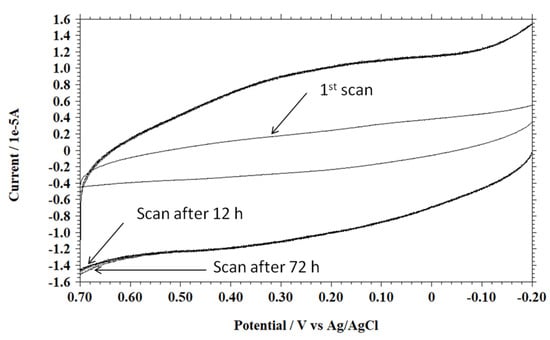 Figure 4 shows the voltammograms of the first scan and scans after 12 h and 72 h, respectively, indicating the stable and successful unzipping of carbon nanotubes.