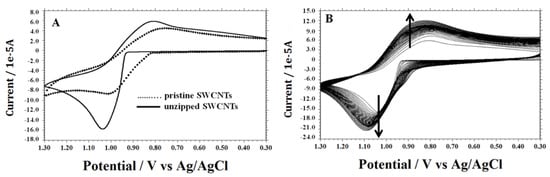 The preparation of these electrode materials is usually time-consuming and high-cost, and requires complicated, multi-step procedures. Therefore, a simple, low-cost preparation method to fabricate electrode is highly desired. In our previous work, we have achieved substantial progress on preparing substrate electrode material including synthesis and characterization of unzipped single-walled carbon nanotubes (unzipped SWCNTs) [36]. The obtained new form of carbon nanomaterial offers high active sites, fast electron transfer kinetics, and effective high surface area.