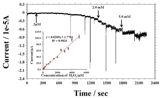 Current–time curve obtained on MnO2/unzipped SWCNTs/GCE with successive addition of different concentration of H2O2 to 0.1 M, pH 7.4, PBS solution; inset: Calibration illustrating the linear relationship between electrode response to the concentration of H2O2.