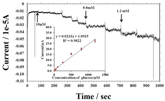 The prepared electrode showed higher stability for amperometric measurement at a constant potential. Figure 9A displays the stability response without addition of glucose to 0.1 M, pH 7.4, PBS solution containing 1 mg/mL GOx at 0.85 V (vs. Ag/AgCl). The reproducibility of the as-prepared electrode was also evaluated by measuring amperometric (Eap = 0.85 V) responses of the sequential addition of 0.1 mM of glucose in 0.1M PBS. The relative standard deviation (R.S.D) was 5.4% suggesting the high reproducibility of the prepared electrode. Moreover, Figure 9B shows the amperometric response of the sequential addition of 0.1 mM glucose, and the common interferents including uric acid (UA) and ascorbic acid (AA) of 0.1 mM for each addition. The significant response for glucose and insignificant responses for interfering species were observed, suggesting good selectivity for glucose detection.