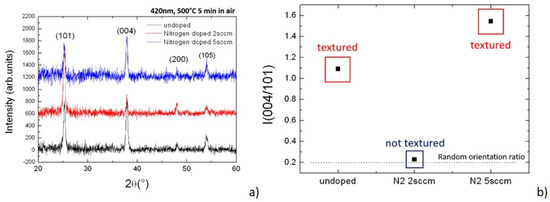 All the starting materials were mostly amorphous. For investigation purposes and to compare the different materials, an internal lattice structuration was triggered by annealing the samples in a furnace at 500 °C. All the lattice structures consequently settled in the anatase arrangement [14] as depicted by the diffraction patterns of Figure 1a. No other polymorphisms were present in the layers. Although the structures look similar, a difference was identified in the texturing degree of the grains [15], a parameter that weighs the reciprocal abundance of the growing planes selected during growth. The related figures of merit are in Figure 1b wherein the relative intensities of the two main planes, namely the (101) vs. (004), were measured in the different growing conditions. Here, we note the first discontinuity when using 2 sccm of N2 during growth—this is the only process that produced a randomly oriented set of anatase grains.
