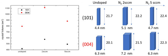 Grains size can be evaluated by applying the Debye–Scherrer calculation to the full width at half maximum (FWHM) of the diffraction peaks. The horizontal and vertical dimension of the nanograins can be also discriminated using different Bragg peaks acquired in symmetric and grazing geometries. The average nanodomain shape and sizes are represented in Figure 2, right panel. In the left panel, we have chosen to represent the average domain volume for two different families of grains having the [101] and [001] growth directions perpendicular to the sample surface. Here, we found a second discontinuity in the volume of the nanograins that was larger in the layer grown using 2 sccm of N2.