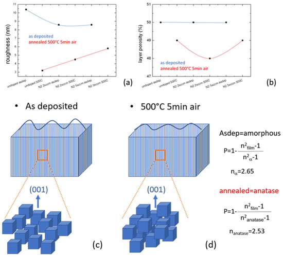 Roughness (a) and porosity (b) of the layers and their change after annealing at 500 °C. Schematic representation of the grain size and distribution inside the layer deposited, before (c) and after (d) annealing at 500 °C.