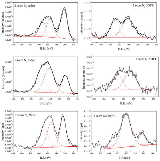 The large band around 400 eV in the as-deposited samples (Figure 6) resulted from two different peaks—the first one centered at 399.7 eV is the peak related to nitrogen atoms in a TiO2 matrix that could be related to nitrogen bonded with both titanium and oxygen atoms [16], and the second one centered at ≈401 eV is related to nitrogen atoms in the organic form. The sample with the highest nitrogen content was the sample prepared with 2 sccm of N2 with respect to the sample prepared at 5 sccm of N2, despite the higher N2 flow used during the deposition process. This result can be explained by competition established between Ti oxidation at the growing front and N2–O2 interaction inside the plasma region due to the particular geometry of the deposition chamber. The common inlet for the O2 and N2 gases is, in fact, located in the bottom part of the chamber, in close proximity to the substrate. At the lower N2 intake, the reactive species are mostly confined above the substrate where they preferentially react with the titanium adatoms landing from the target. At higher fluxes, nitrogen species are evenly distributed inside the plasma, having an enhanced tendency to interact with oxygen into the plasma region. This likely promoted the formation of NOx species and consequent reduction of the amount of nitrogen incorporated inside the film. Accordingly, the growth rate of the titanium oxide film reduces proportionally with increasing the flow rate of N2 [13].