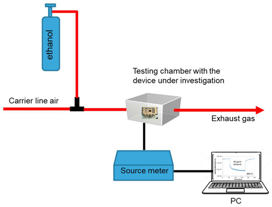 A microheater plate device (MHP) based on a 1.5 µm thin suspended dielectric membrane was obtained through persistent plasma etch of bulk silicon. Over the membrane, a Pt metal layer was shaped to allow heating over 500 °C with a low voltage applied (<2 V). Onto the heater, Pt interdigitated electrodes were tailored to collect charges also from highly resistive sensing layers. Details regarding the micro-hot-plate are provided in a previous paper [12] where we describe each process step in a comprehensive flowchart. The gas sensors were tested in a chamber filled with ethanol vapors in dry conditions. The N-doped TiO2 films were integrated into the sensors over the Pt interdigitated electrodes, as the last step process, using a shadow mask.