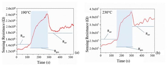 Sensor response to 44 ppm (concentration value after calibration) of ethanol at different working temperatures of (a) 190 °C and (b) 230 °C in the dry condition.