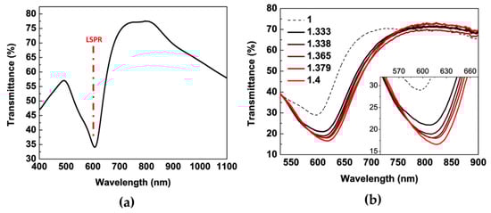 (a) Zero-order transmittance spectrum. (b) Dependence on the refractive index of the wavelength position of the transmittance minimum of the of long-range ordered distribution of NHs, with a diameter of 350 nm and periodicity of 500 nm, realized on a 50 nm-thick Au layer.