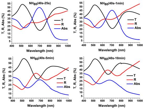 Transmittance (T), diffused reflectance (R), and absorbance (A = 100-R-T) spectra of the NH samples NH80 (40 s–25 s) (topmost left panel), NH80 (40–1 min) (topmost right panel), NH80 (40 s–5 min) (bottom left panel) and NH80 (40 s–10 min) (bottom right panel), measured under normal incidence conditions.