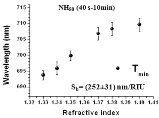 Plots showing the linear dependence on the refractive index of the wavelength position of the transmittance minimum of NH80 (40 s–10 min). The estimated sensitivity values are also reported.