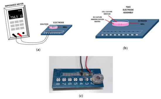 (a) Experimental setup. The electrode is connected to the LCR (Inductance (L), Capacitance (C), and Resistance (R)) meter. (b) Cross section of the cell chamber filled with 3D immobilization matrix. (c) Picture of the well and the electrodes interface.