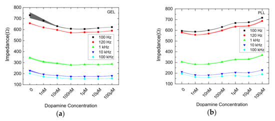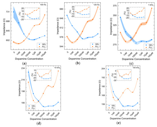 As shown from recent work [37], impedance magnitude measured in various concentrations drops with increasing frequency. Though, corresponding the 3D cell culture, as the concentration increases (1 nM–100 μM), the mean impedance retains almost a constant value according to all frequencies tested, with the exception of the control solution. Gel immobilized cells (blue lines) responded in each DA concentration in a similar, if not identical pattern as frequency increases (R2 > 0.96 as shown in Table 1). On the other hand, impedance values referring to PLL-immobilized cells (orange lines) treated with DA present a different behavior compared to the gel immobilization matrix. For each frequency, a clear increase of the impedance is observed. Generally, a reducing behavior of the impedance is observed as frequency increases with the presence of gel. Additionally, significantly larger values of the impedance of the cells immobilized with PLL is indicated in frequencies below 1 KHz (Table 1). Figure 3 presents the data for all measured frequencies alongside with the error bands defined by the standard deviation.