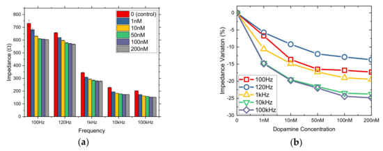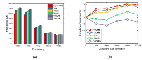 Mean impedance values (a) and % impedance variation (b) for cells immobilized in PLL matrix treated with μM DA concentrations (1, 10, 50, 100, 200 μM) at five different frequencies.