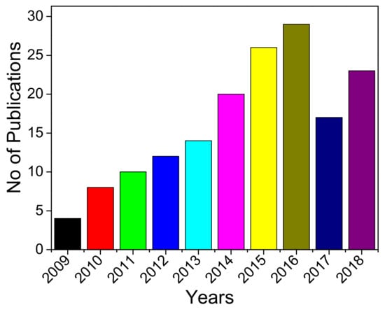 Numbers of publications on melamine sensors from 2009 to 2018 (adopted from Institute for Scientific Information (ISI) Web of Knowledge).