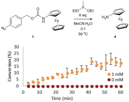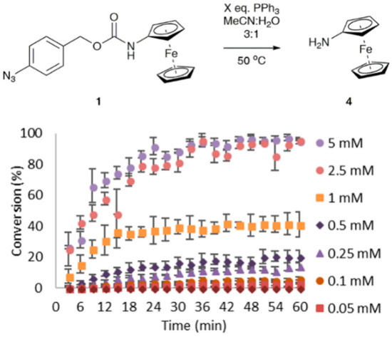 Conversion of probe 1 (1 mM) to aminoferrocene 4 after the addition of triphenylphosphine in MeCN:H2O (3:1, 1M) at 50 °C. Error bars represent the standard deviation where n = 3.