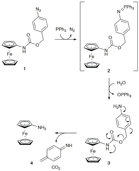 Inspired by trigger–linker–effector methodology [23,24], benzyl ferrocenylcarbamates have been effectively employed for the ratiometric electrochemical detection of both enzymes, such as β-galactosidase and alkaline phosphatase [25,26], and small molecules, such as fluoride and hydrogen peroxide [27,28]. To achieve our objective of developing a molecular probe for organophosphorus(III) species, we designed benzyl ferrocenylcarbamate 1 with a 4-azido trigger to allow for the chemoselectivity for the target to be attained through a Staudinger reaction. In the presence of the target, we proposed that the formation of iminophosphorane 2 would occur, which, under aqueous assay conditions, would be hydrolyzed to give aniline 3; then, a subsequent 1,6-elimination would release aminoferrocene 4 (Scheme 1). Indeed, it has since been brought to our attention that whilst this project was ongoing, the release of aminoferrocene 4 from 4-azidobenzyl ferrocenylcarbamate 1 under reductive conditions had been successfully demonstrated [29]. Due to the significantly different electronic environments surrounding the iron center, aminoferrocene 4 should have a lower oxidation potential (Eox) compared with that of 1; and, thus it should be electrochemically distinguishable.