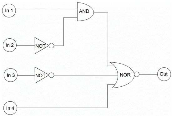 The logic circuit representing the Truth Table 1 (In 1 (UV), In 2 (Vis), In 3 (Zn2+), In 4 (EDTA)).