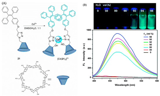 Another popular fluorescent mechanism that is being used in molecular probe design is aggregation induced emission (AIE), a similar mechanism to excimer formation. Wang et al. employed this by tethering a hydrophobic tetraphenylethene (TPE) moiety (hydrophobic part) onto a β-cyclodextrin (hydrophilic part), via a click reaction to give compound 21. Therefore, by varying the ratios of water and organic solvent the mechanism could be turned on and off. The triazole moiety was used as the Lewis basic site to coordinate the Cd2+ ions [171]. In solutions containing ≤50% water, the sensor gave no significant emission when the probe was excited at 330 nm. However, upon the addition of Cd2+ ions, a noticeable emission band emerged around 476 nm. This could be attributed to the overlap of the tetraphenylethene groups as a result of the 2:1 coordination between the sensor and Cd2+ ions. This same behavior was observed as the water content of the solvent system was increased up to 98%. In higher concentrations of water, the solution of the sensor becomes strongly emissive at 476 nm, and this emission was visible with the naked eye, Figure 8. This strong emission was due to the formation of aggregates in solution, owing to the decreased solubility of the sensor. Zhang et al. observed that in a solution of DMSO/H2O (1:1, v/v) the sensor only responded to Cd2+ ions and no other metal ions and they were able to detect Cd2+ ions at concentrations as low as 1 × 10−8 M.