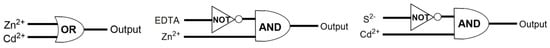 Decomplexation of the [CdCl(26)] complex and subsequent emission turn off could be accomplished with the addition of S2− ions to a solution of the complex. The fluorescence turn-off also served as a means of distinguishing between Zn2+ and Cd2+ ions, as decomplexation of the Zn2+ ion’s complex did not occur in the presence of S2− ions. A Job’s plot verified the binding stoichiometry of the sensor for Cd2+ ions as 1:1 with an association constant of 6.4 × 104 M−1, calculated from a Benesi–Hildebrand plot using the data from UV-Vis titrations. The weak fluorescence band seen around 430 nm is due to the lone pair on the nitrogen atom on the imine group quenching the intensity. However, on chelation of Cd2+ ions with the sensor, the PET process is prevented and the molecule becomes less flexible, as the free rotation of the azomethine carbon is also restricted. The coordination environment was further validated by studying the 1H NMR titration of Cd2+ ions into a solution of the sensor which showed a clear disappearance of the phenolic proton and a downfield shift of the azomethine proton. From the fluorescence titration, an LoD of 0.53 µM for Cd2+ ions was calculated and a fluorescence quantum yield of 0.996 was observed, whereas the fluorescence quantum yield of 26 was calculated to be 0.042. As Zn2+ and Cd2+ produced different optical inputs with one output, a binary logic gate function could be produced Table 3). This selective behavior mimics an OR binary logic gate (Figure 10).