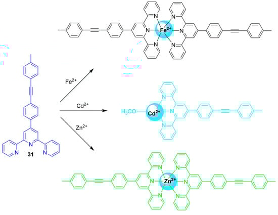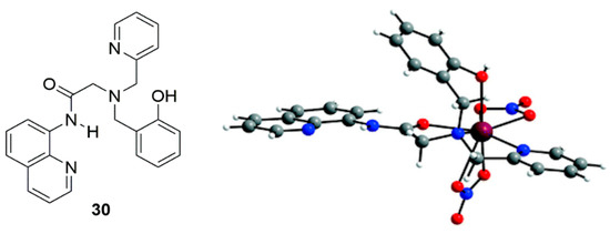 Zinc is arguably the most frequently studied d-block metal, due to its biological importance [91]. The Zn2+ ions are predominantly located within the confines of proteins and enzymes where they are essential to many biological functions [92]. The human body contains approximately 2–3 g of zinc; the amount found in the blood is kept constant (12–16 μM), however, higher concentrations (mM) are localized in many parts of the body, for example in the breast [93], prostate [94], brain [95], and pancreas [96]. The association constants range from tightly bound (log K > 11) and moderately bound (log K = 7–9) to loosely bound (log K < 7), and affect the bioavailability of Zn2+ ions. Loosely bound zinc is responsible for the dark side of Zn2+ ions. For example, free zinc has an active role in neuronal injury [93], and there have since been numerous reports on the acute toxicity of free zinc and its link to neurodegenerative effects in Alzheimer’s disease [97] and amyotrophic lateral sclerosis (Lou Gehrig’s disease) [98]. Low molecular weight probes that can chelate and monitor Zn2+ ions by an optical response are abound [99,100,101,102,103,104,105,106,107,108]. The subject matter appears in many authoritative reviews from investigators that have made seminal contributions in this field [109,110,111,112,113,114,115,116,117,118,119,120,121,122,123].