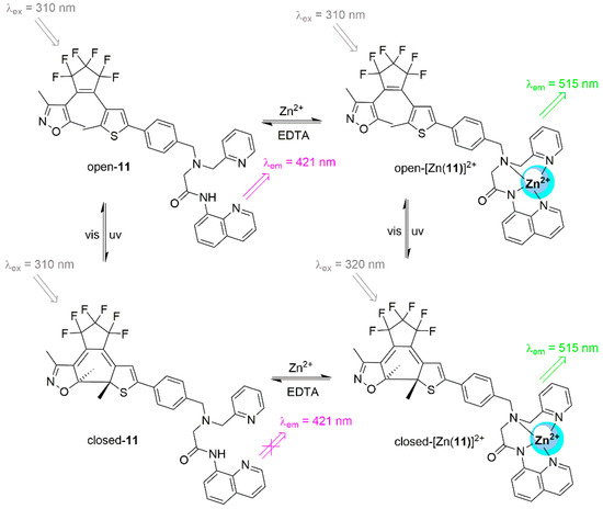 The molecular switching behavior of molecular probe 11 with the interaction of Zn2+ ions/EDTA and UV-Vis stimuli.