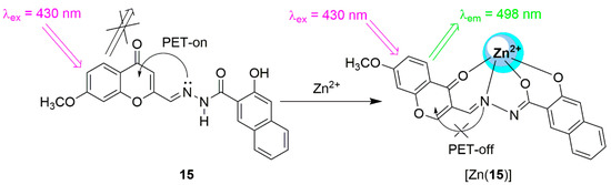 Another dipodal system was developed by Yang et al. who prepared a mixed fluorophore receptor (coumarin-naphthalene) which contained a very elaborate chelating motif, compound 15, Scheme 3 [160]. The absorbance spectra showed a hypochromic shift at 335 nm and a hyperchromic shift at 430 nm, through a pseudo-isosbestic point at 307 nm. The binding isotherm was sigmoidal, which is indicative of cooperative binding. The fluorescence spectrum in EtOH (50 μM) showed a very strong emission band at 498 nm (λex = 430 nm). There was a preference to the Zn2+ ions, in comparison to the other metal ions studied (Al3+, Ba2+, Ca2+, Cu2+, Hg2+ Co2+, K+, Mg2+, Mn2+, Na+, Cr3+, Li+, Pb2+, Cd2+, Ag+ and Fe3+), however, competition experiments showed that both Cu2+ and Fe3+ significantly quenched the fluorescence intensity, when added to a [Zn(15)]2+ solution. The binding constant was calculated to Ka = 2.0 × 104 M−1, using the Benesi–Hildebrand method and the stoichiometry was confirmed by a Job’s plot. The fluorescence signal was off in the initial state, as a consequence of the C=N isomerization and PET quenching. On addition of the Zn2+ ions, the fluorescence was turned on via the CHEF mechanism. The limit of detection (LoD) was calculated to be 10−7 M.