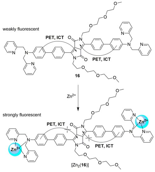 Another dual fluorescence mechanism used in sensor technology is the PET and ICT quenching approach, which is inhibited by the addition of Zn2+ ions. Molecular probe 16, Scheme 4, was synthesized by Wang et al. [161] based on a (1,4 diketo-3,6-diphenyl-pyrrolo[3,4-c]pyrrole derivative, which is known to be a brilliant red and strongly fluorescent dye. Additionally, this organic fluorophore is stable to heat with high photostability and shows a large Stokes shift, which makes it an excellent choice in sensor design. Compound 16 shows a weak emission band at 630 nm (φ = 0.07), in the absence of Zn2+ ions, but upon the addition of Zn2+ ions to compound 16, a blue shift to 560 nm (φ = 0.85) was observed; no other metal ion showed this enhancement. The optical studies (absorbance and fluorescence), and the NMR studies showed that no further optical or structural changes occurred after the addition of two equivalents of Zn2+ ions. A binding constant of 4.69 × 107 M−2 was determined using the fluorescence data and the stoichiometry was confirmed as a 2:1 metal:probe complex formation, through MS studies.