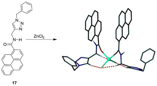 Throughout this section there have been examples of molecular probes for the detection of Zn2+ ions, but very few papers also discuss the counter-ion effect in their systems. Zinc complexes (in particular ZnCl2) also play an important role, as a moderate strength Lewis acid, in Friedel–Crafts acylations. Our own group has prepared pyrene-based molecular probes 17 and 18 [162]. Compound 17 was shown to simultaneously bind the cation and anion, in a self-assembled process. Self-assembly occurred in the presence of ZnX2 salts (X = F−, Cl−, Br−, I−, BF4−, CH3CO2−, H2PO4−, ClO4−, CN−, NO3−) and ZnSO4. The optical response was due to a strong excimer band observed at 410 nm in the presence of ZnCl2 in acetonitrile. DFT calculations supported the proposed structure (Scheme 5). The intensity of the excimer signal was dependent on the proximity of the two pyrene units. In absence of the Zn2+ ion, the excimer signal was not observed, as was confirmed by the analogous spectroscopic studies with tetrabutylammonium salts, i.e., the metal was required for the self-assembly process to occur. This suggests that the Zn2+ halide was templating the pyrene units. The geometry around the Zn2+ ion was tetrahedral and the pyrene moieties adopted a syn configuration. The fluorescence titrations were in good agreement with the NMR studies, which showed a 2:1 binding mode calculated by non-linear regression with a calculated binding constant (K21) of 1.8 × 106 M−2 for ZnCl2. This example was a good example of size-selective self-assembled recognition and was carried out at a low concentration, to rule out intermolecular excimer formation.