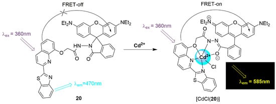 A FRET molecular probe incorporating rhodamine was synthesized by Goswami et al. Chemosensor 20 was shown to be selective for Cd2+ ions, with the sensor acting as an ‘off–on’ FRET sensor capable of detecting Cd2+ ions in a mixed organic–aqueous solvent system. Additionally, a distinctive color change was seen, typical of rhodamine dyes. A quinoline–benzothiazole functional group (FRET donor) was tethered to the rhodamine molecule (FRET acceptor), via a nonconjugated spacer, Scheme 7 [172]. As the emission spectra of the quinoline benzothiazole group overlapped significantly with the absorption spectra of the ring-opened rhodamine B dye, it was possible to observe the transfer of energy from donor to acceptor, once the sensor interacted with the Cd2+ ions. Both the quantum yield and FRET efficiency of the sensor were calculated from fluorescence studies carried out in MeOH/H2O (1:4, v/v, pH 7.2, 10mM HEPES buffer solution) and were found to be φ = 0.37 and 48%, respectively. These experimental conditions were optimized for the water content. They reported that when the percentage of water was increased above 80%, the intensity ratio (I585/I470) of the emission band decreased significantly, whereas less water content showed modest changes in the emission intensity. From the fluorescence titration, Aich and coworkers found that the lowest concentration of Cd2+ ions detectable by the sensor was 3 × 10−7 M and the association constant (determined using a nonlinear least-squares fit) was found to be 1 × 105 M−1. The other metal ions studied (K+, Ca2+, Ni2+, Mn2+, Zn2+, Cu2+, Fe3+, Cr3+, Hg2+, and Pb2+) did not show the same optical response. The 1:1 binding mode was confirmed both in solution and in the solid state. The X-ray crystal structure confirmed that the Cd2+ binds in an octahedral environment with five of the donor groups from compound 20 and a chloride ion in the remaining coordination site.
