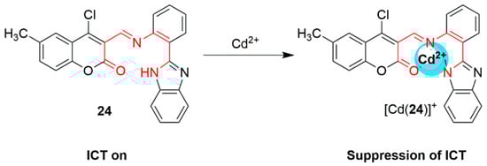 Siva and Chellapa synthesized a ratiometric benzimidazole tagged coumarin probe 24. Compound 24 could selectively detect Cd2+ and F− ions in a CH3CN/H2O (1:9, v/v) HEPES-buffered solutions at pH 7.52, Scheme 9 [178]. The UV-Vis absorption spectrum showed three distinct bands at 292, 342, and 401 nm. The addition of Cd2+ ions led to a hyperchromic shift at 292 and 343 nm, and a hypochromic shift at 401 nm, through an isosbestic point at 367 nm, indicative of metal complexes in solution. Upon exciting probe 24 at 340 nm, two distinct emission bands at 410 and 530 nm were observed. The addition of Cd2+ ions led to a blue emission band at 410 nm and an increase in emission intensity, at 530 nm, through an isoemissive point 518 nm. From these spectral changes the association constant was calculated to be 3.5 × 103 M−1, using a modified Benesi−Hildebrand method and the LoD was determined to be 1.5 × 10−10 M. The addition of the Cd2+ ions inhibited the intermolecular charge transfer (ICT) between the lone pair on the secondary amine in the imidazole ring system and the carbonyl group on the coumarin unit. It is reasonable that the molecular probe would chelate the metal ions in a tridentate fashion, via the three Lewis basic sites (Scheme 9, red bonds). Additionally, the authors carried out an extensive anion study which showed very little spectral changes for a number of tetrabutylammonium salts (TBAX, where X = F−, Cl−, Br−, I−, OAc−, NO3−, H3PO4−, CN−). Fluoride was the only anion to produce a small changes in the fluorescence spectrum, which was also shown to inhibit the ICT mechanism, by forming a hydrogen bonding interaction with the NH group in the benzimidazole group.
