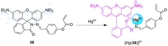 A rhodamine-based conjugated dyad probe (19) has been synthesized by Stalin and coworkers (Scheme 6) [171]. The authors claimed that the FRET mechanism between the rhodamine and pyridine conjugated dyad is responsible for the emission observed upon the coordination of Cd2+ ions in the organic–aqueous system (CH3CN:HEPES buffer 2:8, v/v, pH 7.2, 10 mM). However, upon inspection of their molecular probe, it is difficult to justify the authors claim. For FRET to occur, several criteria must be met: (i) the fluorescence emission spectrum of the donor molecule must overlap the absorption or excitation spectrum of the acceptor chromophore, (ii) the two fluorophores (donor and acceptor) must be in close proximity to one another (typically 1 to 10 nm), (iii) the transition dipole orientations of the donor and acceptor must be approximately parallel to each other, and (iv) the fluorescence lifetime of the donor molecule must be of sufficient duration to allow the FRET to occur. The pyridine unit alone is not usually considered a fluorophore. It is more reasonable to assume that the mechanism is an off–on fluorescence mechanism, based on the spirolactam ring opening. However, the authors did show high selectivity and sensitivity towards Cd2+ ions in the presence of other competing metal ions, which was indicated by the appearance of a new fluorescence band at 590 nm, due to Cd2+ coordination. Spectroscopic studies were used to determine a LoD of 1 × 10−8 M, which is well below the WHO acceptable limit of 1.85 mM for Cd2+ ions in drinking water. Both the association constant and binding ratio were determined from the absorption spectra. The absorption titration was used to calculate an association constant of 4 × 104 M−1 and, from the Job’s plot data, the binding ratio was found to be 1:1. In the presence of sulfide ions CdS was formed, which resulted in decomplexation and the disappearance of the emission band observed at 590 nm. The results described above suggest that the sensor was recycled during the detection of S2− ions.