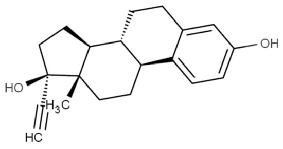 In recent years, there has been some concern regarding environmental contaminants as endocrine disruptor compounds (EDCs). These deregulators have shown adverse effects on the endocrine system of humans and other animals, affecting the health, growth, and reproduction of these species, and further, may act as inducers of cancer [1,2,3]. EDCs encompass countless chemical groups among which are steroid estrogens of both natural and synthetic origin [4]. Belonging to the class of the EDCs, 17α-ethinyl estradiol (EE) (Figure 1) is a synthetic estrogen widely used as an oral contraceptive and is considered a powerful estrogenic [5].