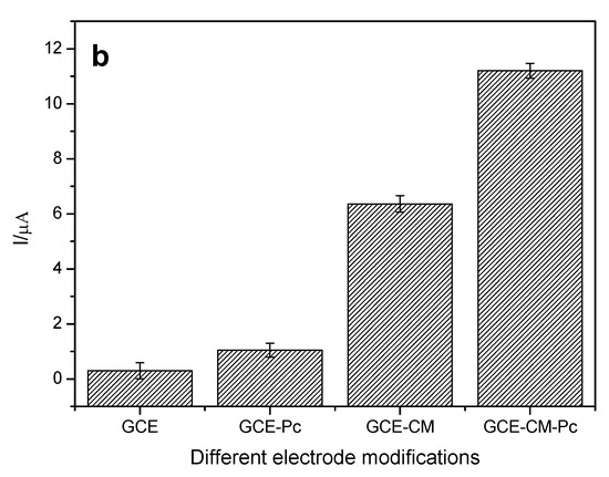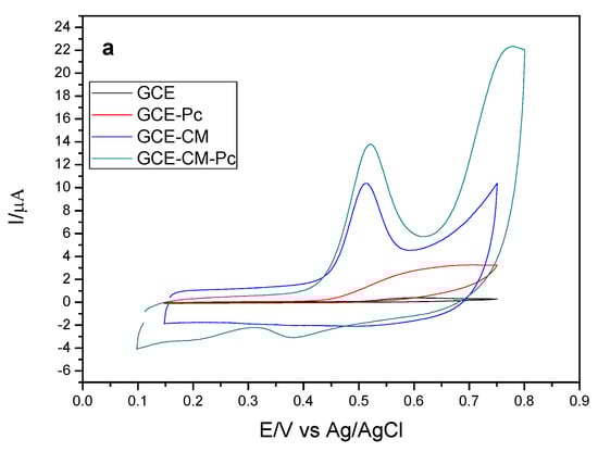 Initially, the influence of the modification of the surface of the working electrode on the response of the analyte of interest was evaluated. Thus, electrodes with different configurations were prepared, being: the bare glassy carbon electrode (GCE), the GCE electrode with carbonaceous material (CM), in which the MWCNT (GCE-CM), the electrode GCE with metal phthalocyanine (Pc), in which cobalt phthalocyanine (GCE-Pc), and the GCE electrode modified with carbonaceous material (MWCNT) and metal phthalocyanine (Cobalt), (GCE-MC-Pc) were used. The variations of anodic peak current are shown in Figure 2a,b for each configuration of the working electrode.