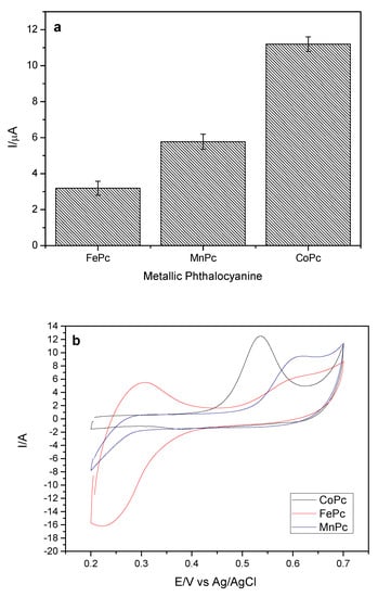 In order to optimize the experimental parameters that influence the sensor response to the studied analyte, the effect of the different phthalocyanines in the preparation of the working electrode was evaluated. The phthalocyanines of cobalt II (CoPc), manganese III (MnPc) and iron III (FePc) were evaluated, keeping MWCNT as carbonaceous material. The variation of the anodic peak current (ΔI) for the analyte in relation to the different phthalocyanines can be observed in Figure 3a.