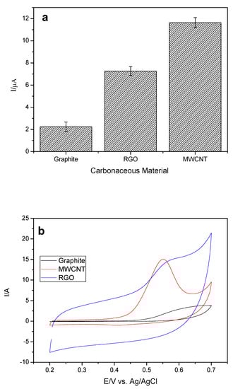 Next, the carbonaceous material used in the modification of the working electrode was evaluated. The concentration of the cobalt phthalocyanine II (CoPc) remained fixed, since it was the one that provided the greatest current variation (ΔI). Multiwalled carbon nanotube (MWCNT), reduced oxide graphene (RGO), and graphite were evaluated as these materials present advantageous characteristics, such as large surface aeration and rapid transfer of charge. The variations of the anodic peak current (ΔI) for the analyte in relation to the different materials can be observed in Figure 4a,b.