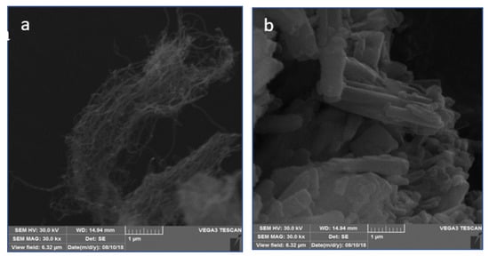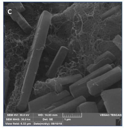 Figure 6 represents, respectively, SEM images of the MWCNT (Figure 6a), cobalt phthalocyanine (Figure 6b), and the materials that form the composite (Figure 6c). It is possible to verify that MWCNTs present as an irregular surface tangle as this structure increases the effective area of the device when deposited on the surface of the electrode by increasing the contact between the surface of the electrode and the solution. From Figure 6c it is possible to observe that the CoPc crystals are distributed over the MWCNT without the formation of large aggregates of the latter on the MWCNT. Additionally, the SEM image for CoPc makes it evident that the absence of carbon nanotubes resulted in deposits made up of aggregates of CoPc molecules (Figure 6b).