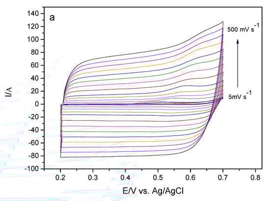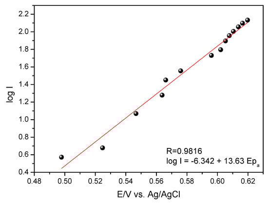 where |Sa| is the angular coefficient of the line obtained between the anodic peak potential as a function of the logarithm of the anodic current intensity (Figure 9); αa is the coefficient of electronic transfer; F is the Faraday constant (96,485.34 C mol−1); R is the ideal gas constant (8.31 J mol−1 K−1), and T is the temperature (298.15 K). As can be seen in the expression, there is no need to know the number of electrons evolved in the process.